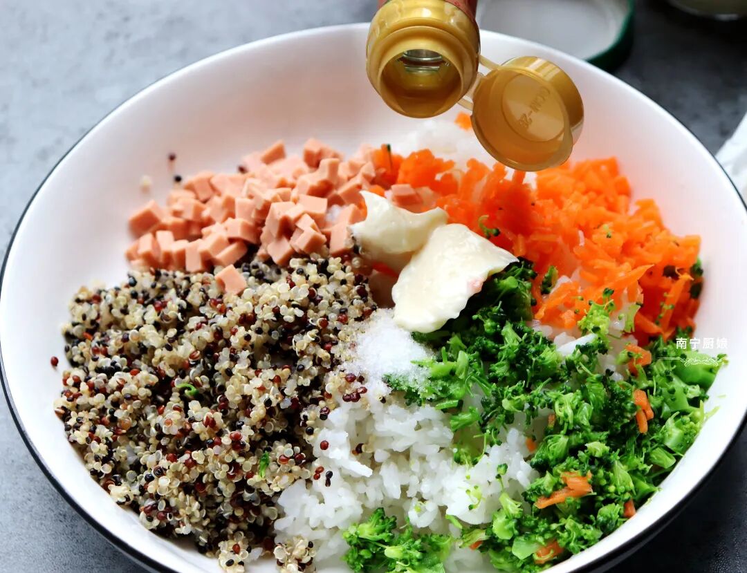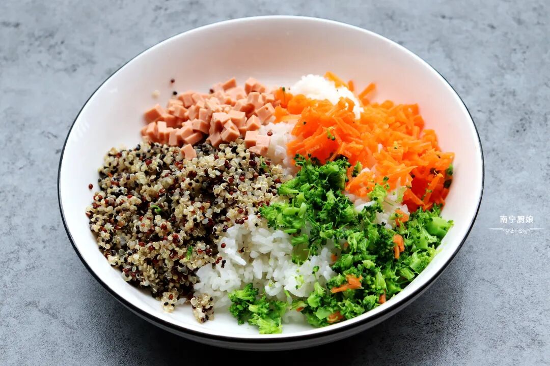 4、把白米饭装入大碗中,然后放入藜麦、西兰花碎、胡萝卜碎、火腿肠丁。