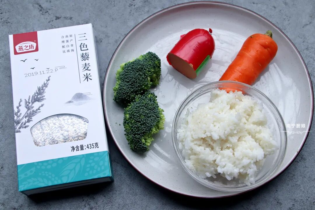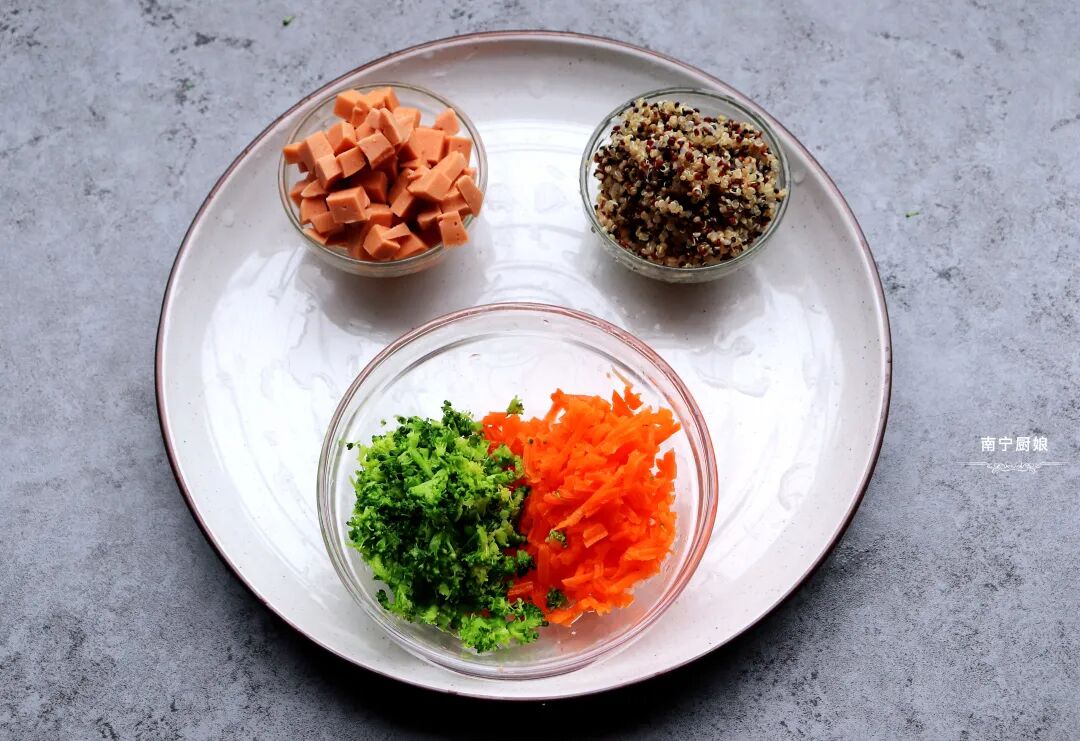 准备好食材:燕之坊三色藜麦米150g、米饭180g、西兰花50g、胡萝卜50g、火腿肠120g、调味料白醋6g、糖3g、盐2.5g、沙拉酱15g、油(焯水用)3g。