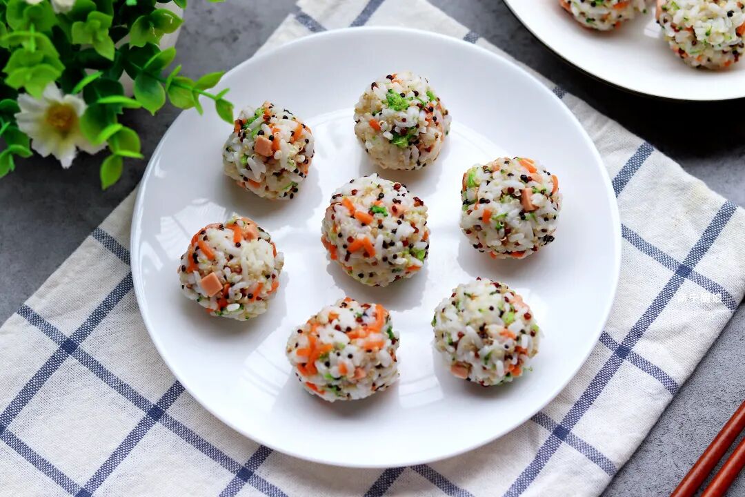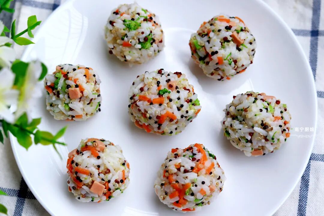 米饭团都揉好后,摆盘上桌,一盘可爱美味的藜麦饭团就做好啦!加入了藜麦的饭团吃起来口感果然不一样,吃起来带着点坚果的清香味,咀嚼起来有点松脆Q弹,妙不可言。有了西兰花和胡萝卜自己藜麦的加入,饭团变得五颜六色的,卖相特别讨人喜欢,家里的小孩特别爱吃,一上桌就自己就直接干掉了4个,还想着把剩下的占为己有,真是让人哭笑不得。