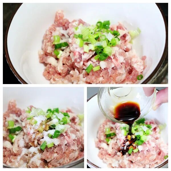 1,腌制肉末。将剁好的肉末放入干净的碗中,加入适量的盐、生抽,洒点葱花,用筷子拌匀。