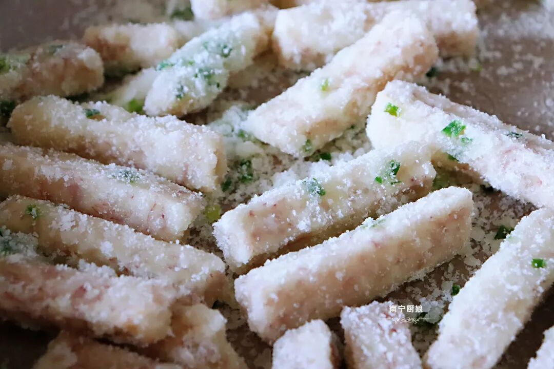 1、芋头清洗干净去皮后切成块后再切成粗细一致的小方条,香葱洗干净后切碎装碗待用。