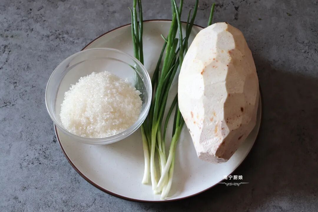 准备好食材:荔浦大芋头1个、白砂糖200克、香葱1把。