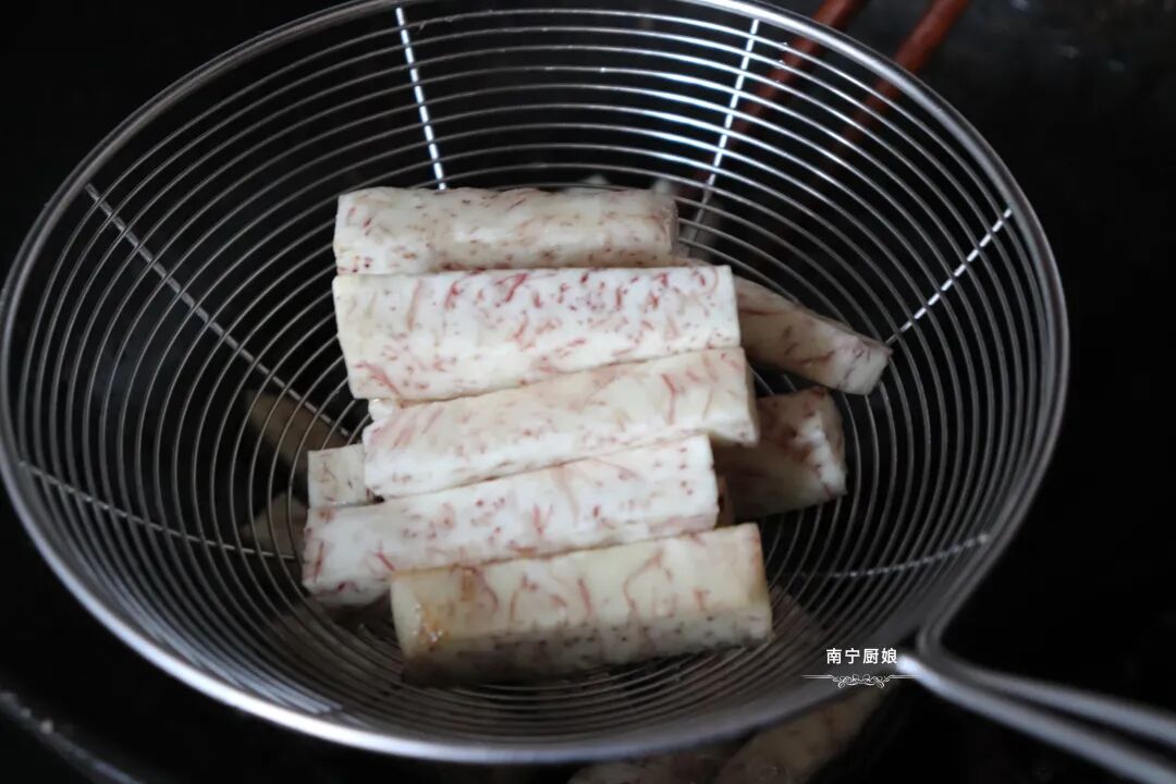 3、把芋头油炸至外皮酥脆,呈现微微焦黄即可捞出控油后装盘待用。