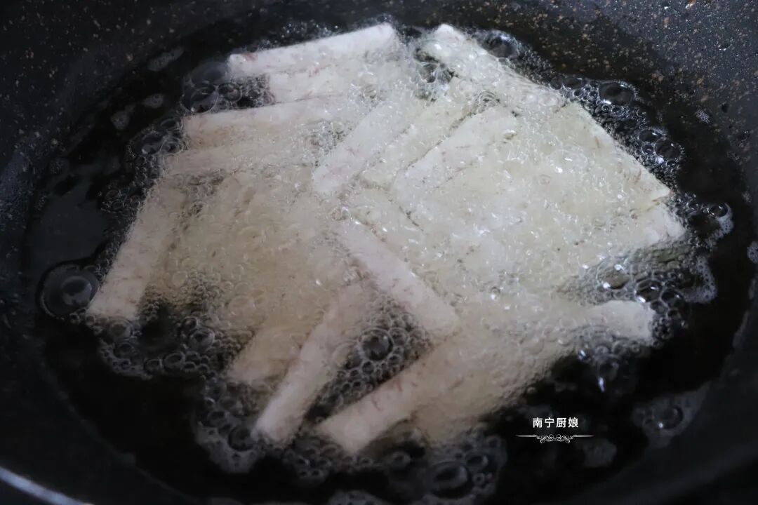 2、在锅中倒入半锅油,开火烧至锅中油6层热,家里没有油温表也不知道怎么判断油温的朋友,可以在油中放入一根木筷,如果木筷周边不断冒出油泡就说明达到需要的油温了。然后把芋头条放入锅中油炸8分钟左右。