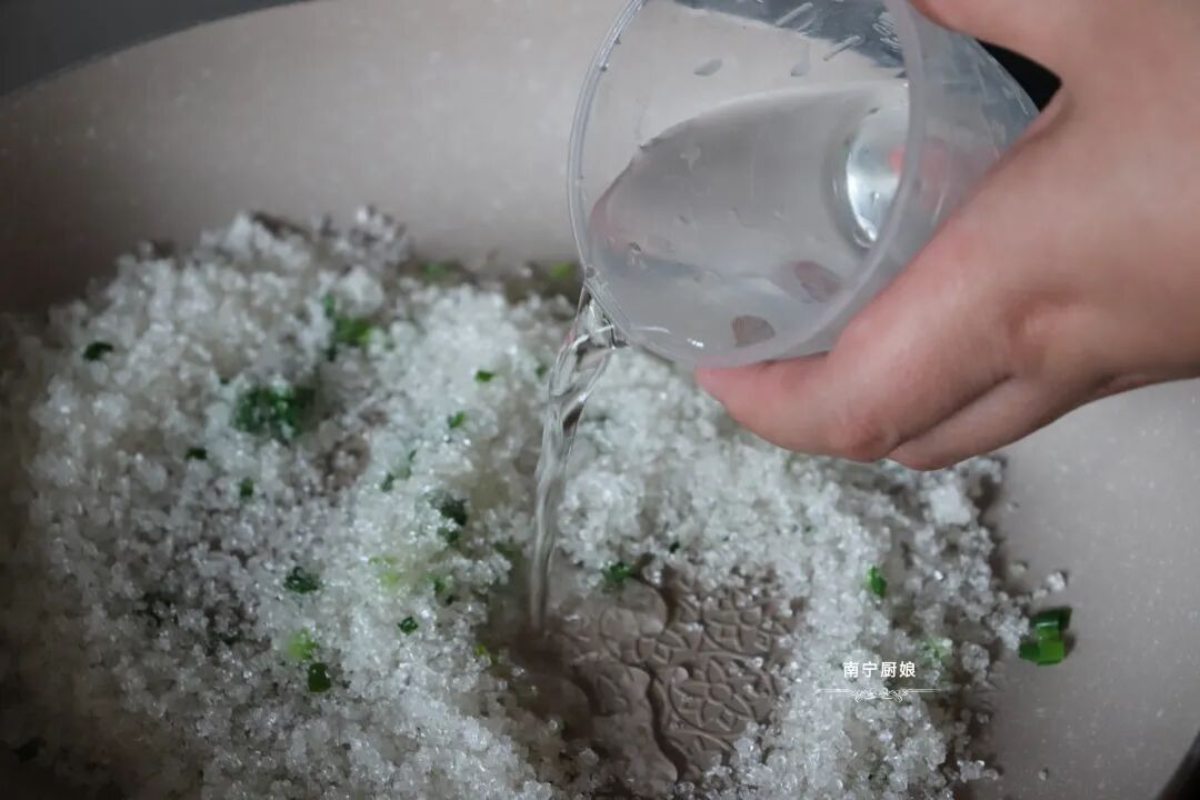 4、重新用一个锅倒入少量油,开火烧热,把香葱碎倒入煸出葱香味。调小火,倒入200克白砂糖和50克清水烧融白糖。