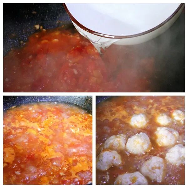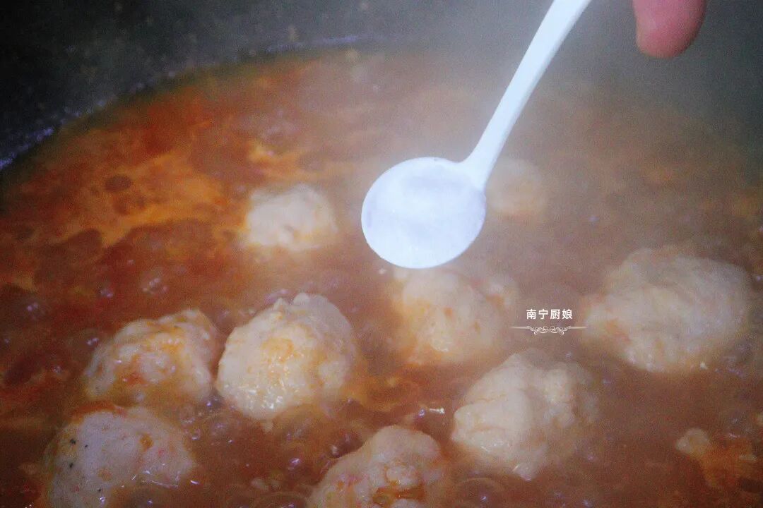 5,倒入适当开水,待开水翻滚,用勺子将拌好的虾蓉一勺一勺放入汤中,形成一个个的虾圆。