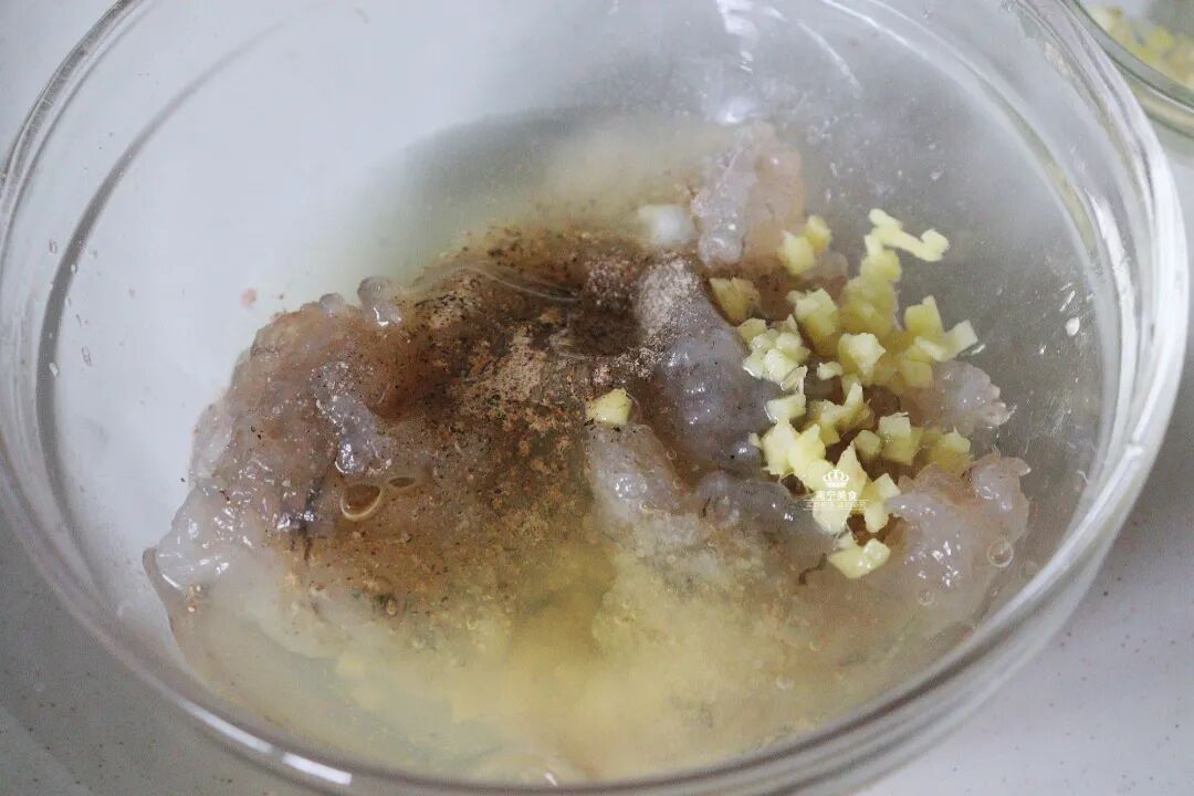 2,在虾蓉里放入姜末、盐、蛋清及胡椒粉,搅拌均匀。