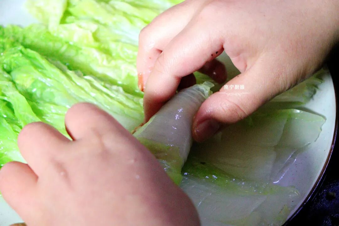 4,开始用你灵巧的手把肉末卷起来,先把根茎部分卷好,到叶子部位先把两边叶子向中间折叠,像叠衣服一样,继续向前卷。卷好后一个一个放碗里排好队。