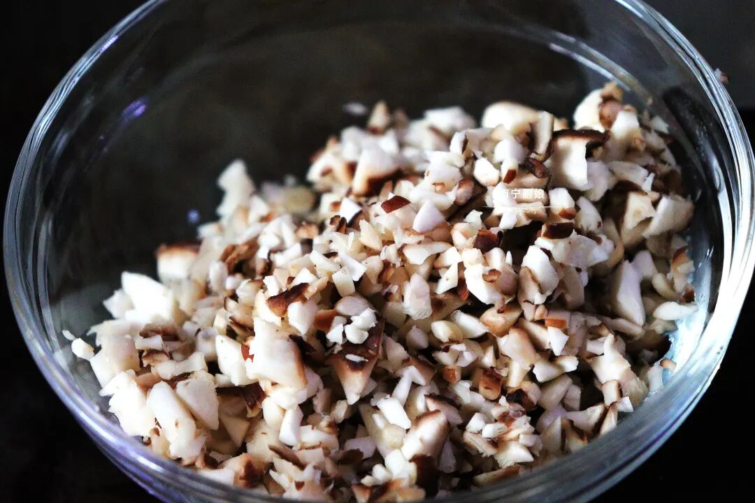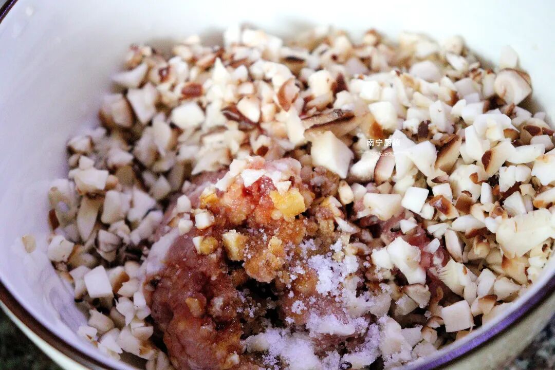 2,将剁好的肉末和香菇末放入碗中,加入生抽、盐,搅拌均匀。