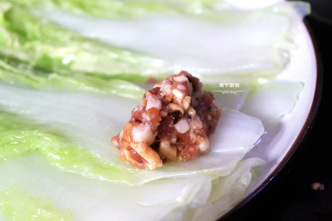 3,拿一片焯过水的白菜,将已经拌好的肉末及香菇末放适量至白菜根茎部的尾端。
