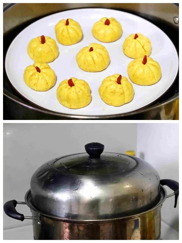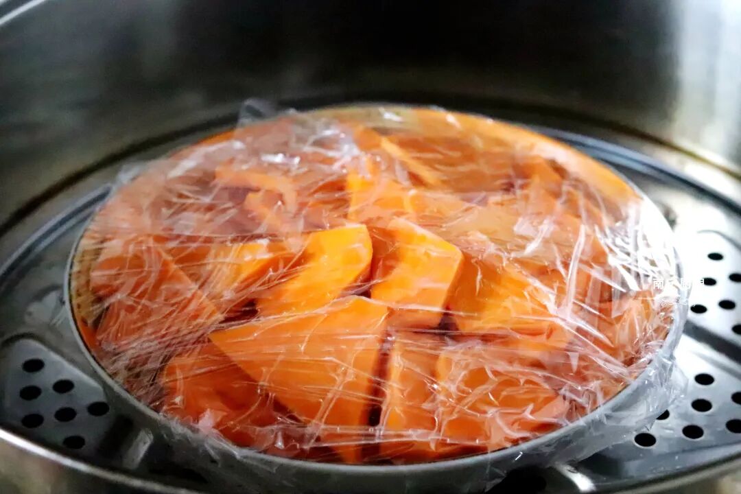 4,如果不用保鲜膜,在蒸南瓜时可以在南瓜上盖一个大碗以防水汽渗入,盖在上面的碗一定要比装南瓜的大,不然起不到效果。这个方法蒸南瓜饼的时候也同样适用。