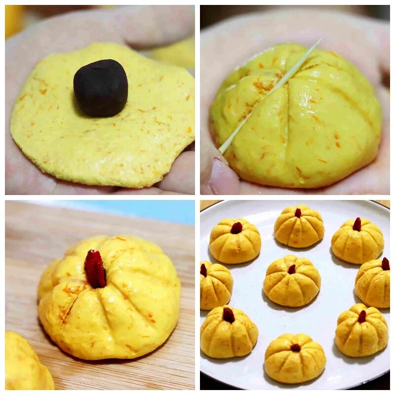 5,接下来,见证奇迹的时刻到了。找根牙签,没有牙签就找把不锈钢勺子,用勺子的边沿代替,把牙签在圆圆的饼胚轻轻的按压,沿着饼胚的弧度,由下而上的按压,像切蛋糕一样,把牙签印均匀地按在饼胚上,一般把饼胚分成四或六等份,就差不多了。当当当当!一个小小的南瓜就出现了,最后在饼胚的中间放一粒红枸杞做点缀,完美!