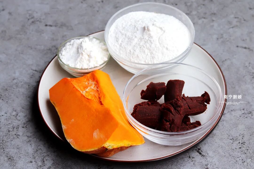 所需食材:老南瓜、糯米粉(多)、玉米淀粉(少)、白砂糖、豆沙