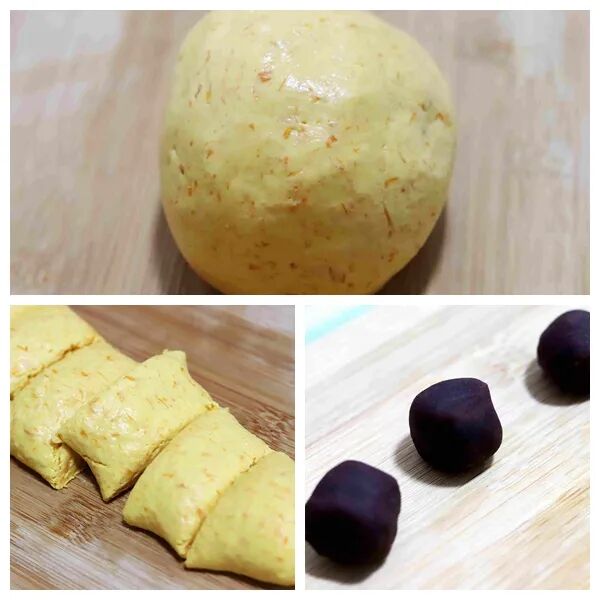3,将搅拌好的南瓜、糯米等混合物,用手揉成一个光滑不粘手、没有明显颗粒的面团团,然后将之分成大小均匀的若干等分,这南瓜饼的表皮料就做好了。将买来的豆沙也分成跟表皮一样的若干等分,因为是用来做南瓜饼的馅,所以大小比表皮要小一些,这样才好包。