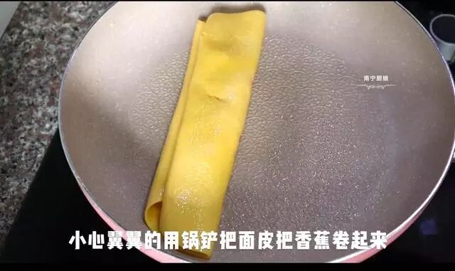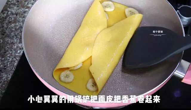 4、用锅铲小心翼翼地把两面鸡蛋皮翻折上去,把香蕉片给包起来,以两排香蕉片中心线作为对折点折起来。