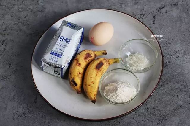 准好食材:香蕉1根(我用的是2根小芭蕉代替)、酸奶1盒、面粉30克、鸡蛋1个、白砂糖5克、食用油3克。