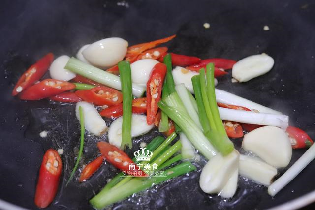 1、锅中烧少量油,使用小火即可。葱姜蒜和小红椒都放进去进行炒香。
