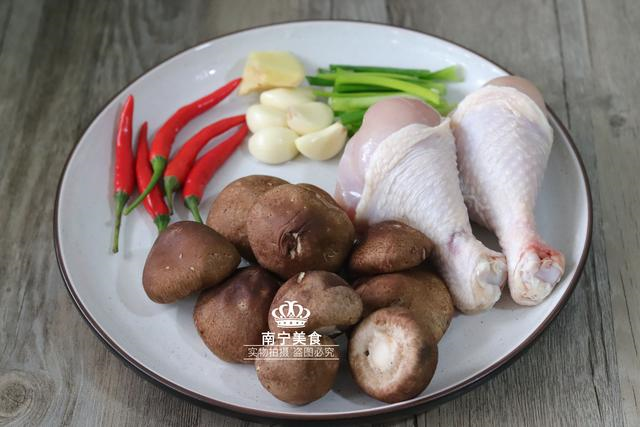 所需食材:鸡腿,香菇,小红椒,蒜,生姜,葱,料酒、生抽,耗油、老抽,盐,胡椒粉,生粉。
