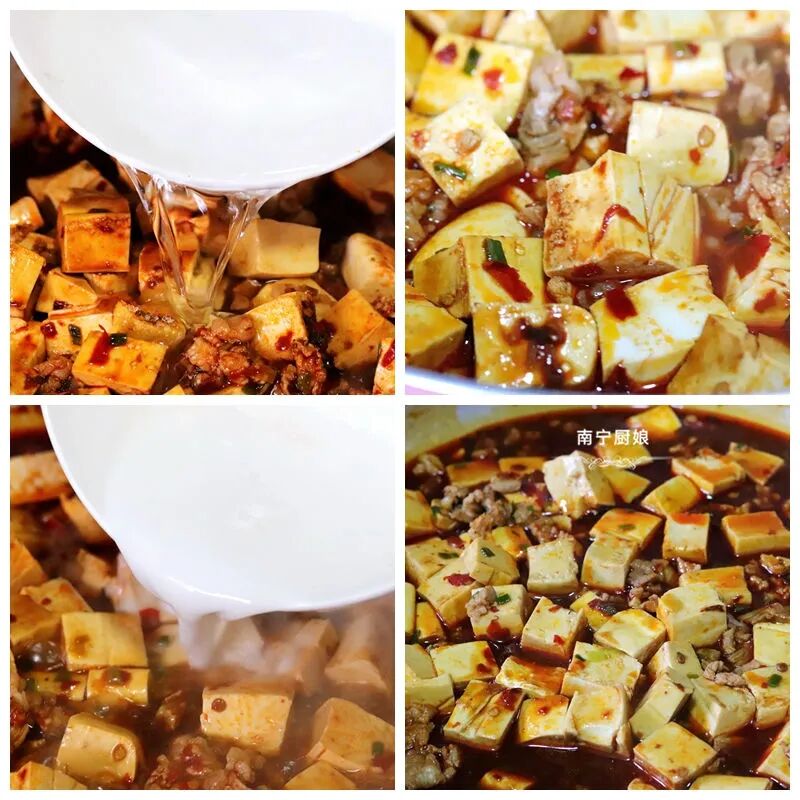 3,在锅中倒入小半碗清水,大火烧开,让豆腐与肉末还有其它调味料一起在水中“相亲相爱”,做到“你中有我,我中有你”,等汤汁收至一半的时候,将淀粉倒入盛有少量温水的碗里搅拌均匀,然后一边慢慢倒入锅里,一边翻炒,让淀粉能充分融入,这时候汤汁就会慢慢变得浓稠,豆腐的上色也更深。