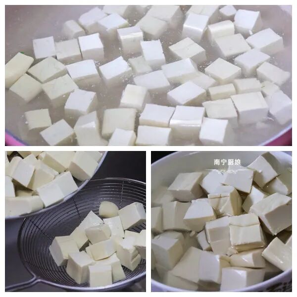 2,烧一锅水,将准备好的豆腐块放入焯水,焯好后捞出放在冷水里,备用。