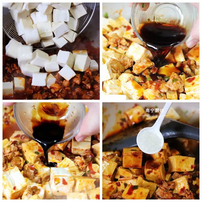 2,这个时候,将还浸在冷水中“泡澡”的嫩豆腐捞出来,沥干水分,下到已经在等待它的肉末中,翻炒片刻,下入生抽、酱油、盐调味,翻炒均匀。这时候,颜色已经非常好看了,红亮红亮的,香味也让人食指大动。