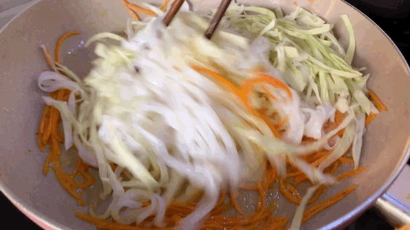 3、胡萝卜丝炒出胡萝卜色的底油后,把包菜丝和扁粉也倒入锅中用筷子一起翻散,手臂力气大的也可以颠锅。