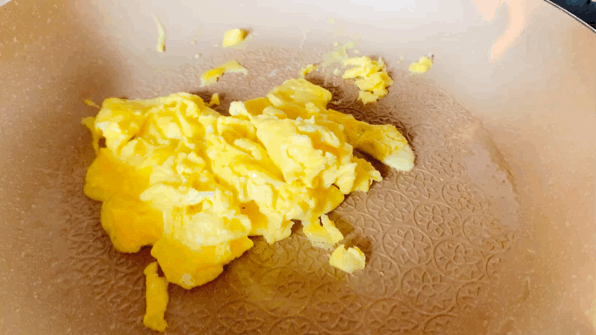 1、起锅,平底不粘锅中刷上一层油,小火烧热后,把蛋液倒入锅中,烧至蛋液凝固蓬松后,用筷子把鸡蛋给划成小块后盛出装碗待用。