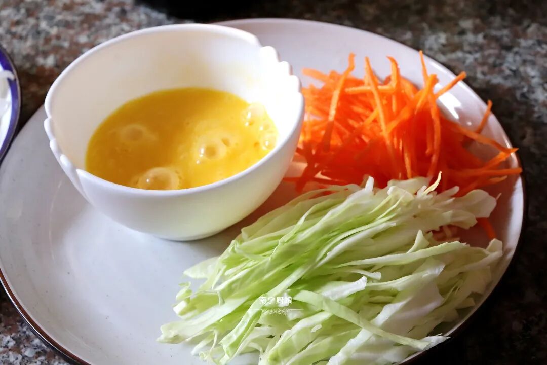 准备工作:把鸡蛋打入碗里,放入适量的食盐打散;胡萝卜用刮丝器刮成丝;包菜切成丝。