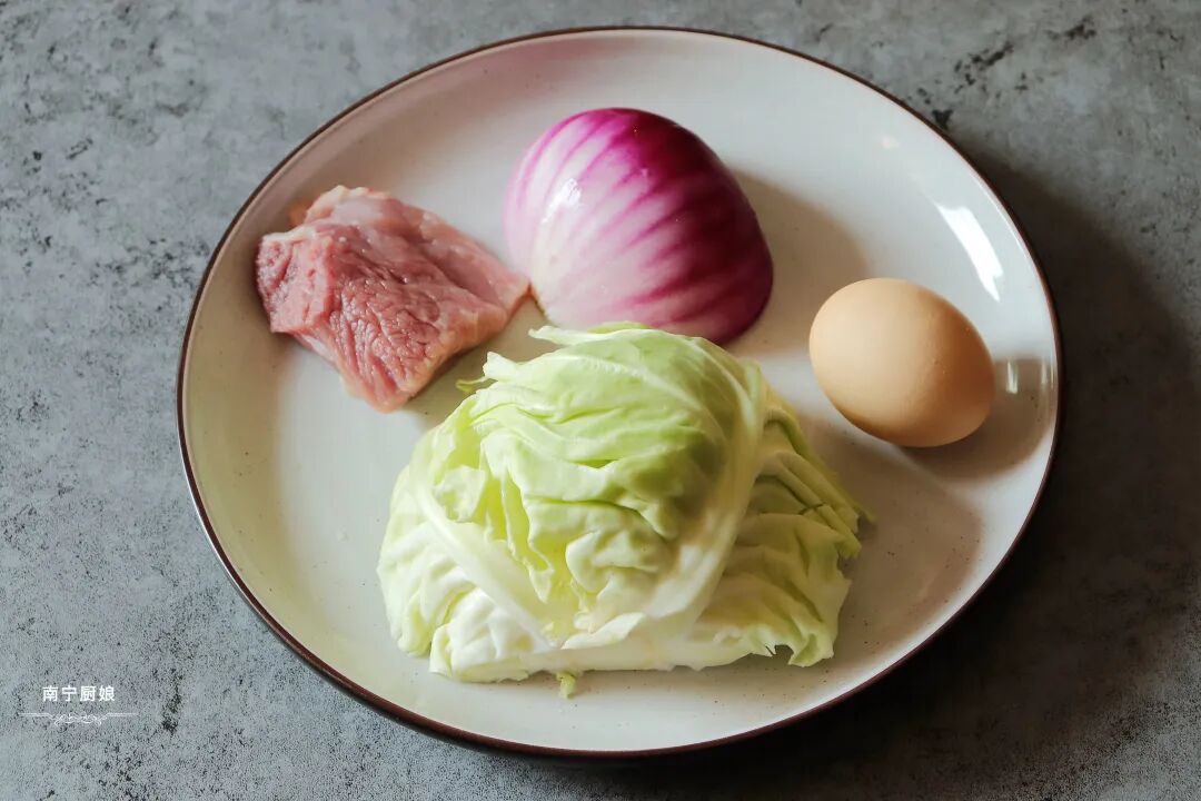 准备好食材:米饭200克、鸡蛋1颗、卷心菜200克、猪瘦肉200克、洋葱100克、食盐1勺、生抽半勺、老抽5克。