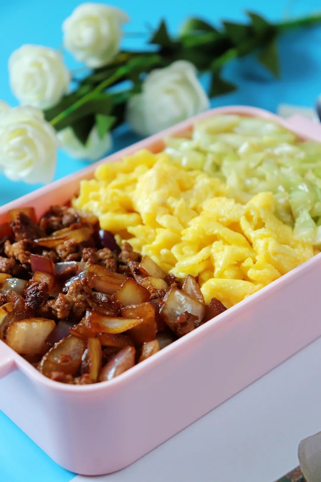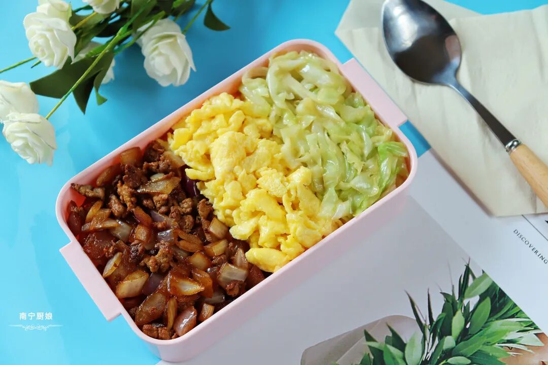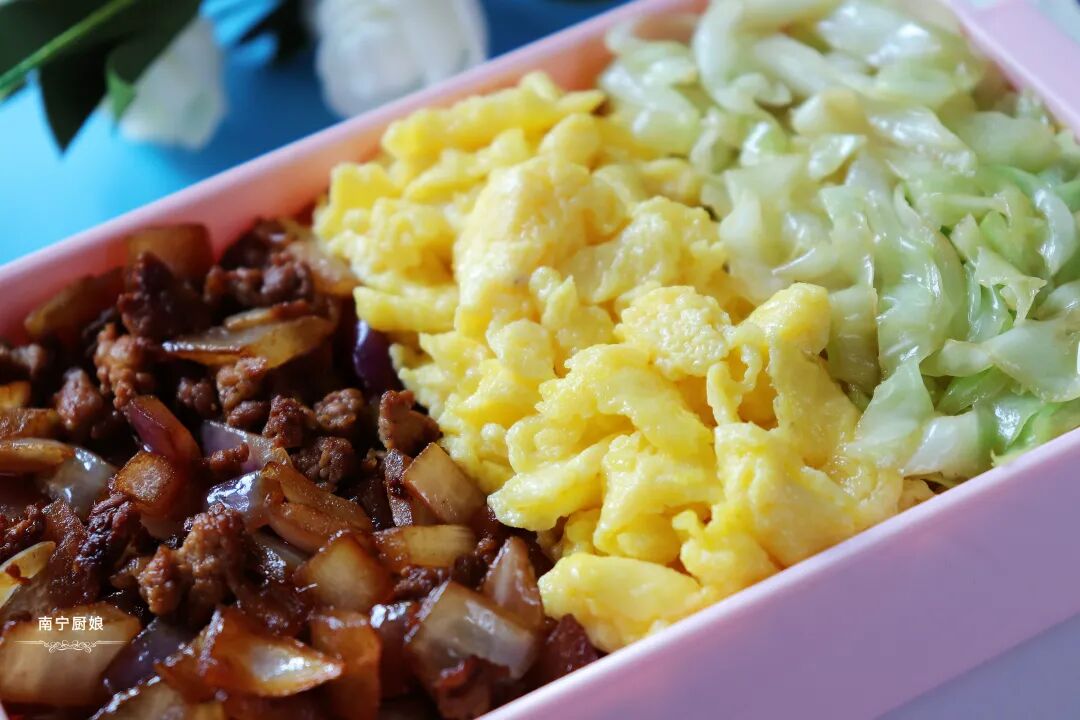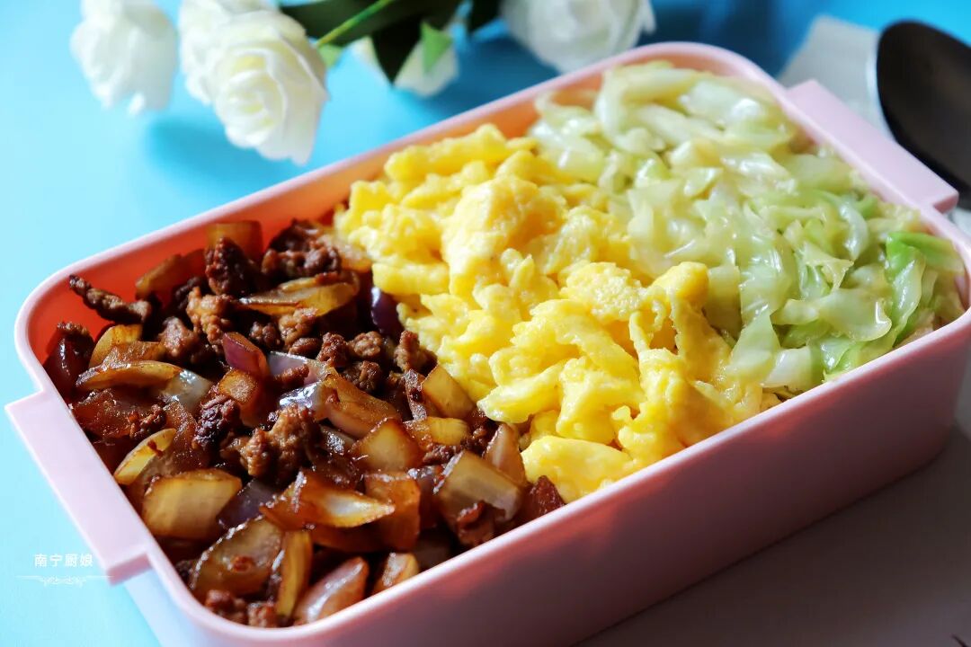 这款三色便当由洋葱炒肉末、炒鸡蛋、卷心菜丝的三种颜色构成,卖相上相当有颜值,让人看着就有食欲。在营养和口感上,荤素食材搭配,营养丰富又全面,吃起来也是相当美味!喜欢的朋友赶快试试吧!