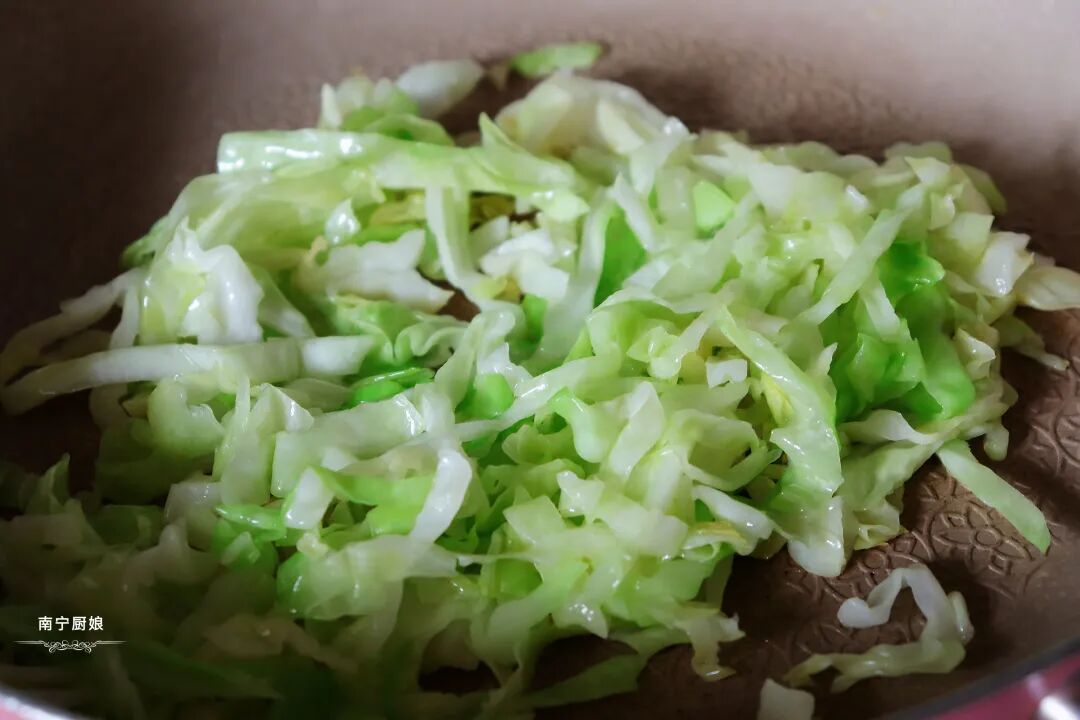 3、继续在平底锅中倒入适量油,小火烧热,把卷心菜丝倒入锅中翻炒至8成软,然后放入生抽和食盐调味,翻炒均匀盛出备用。