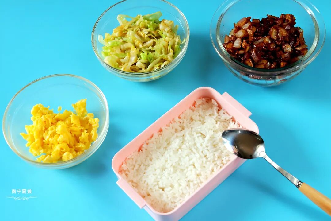 6、最后一步,咱们依次把洋葱炒肉末和炒鸡蛋、卷心菜分格铺在米饭上。
