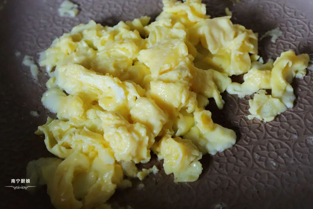 2、起锅倒入少量的食用油,开小火烧热油,把鸡蛋液淋入平底不粘锅中,然后用锅铲将蛋液炒散成小块,然后盛出备用。