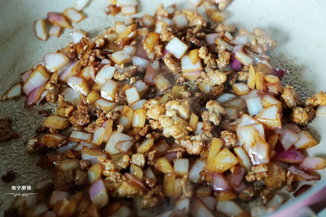 4、继续在平底锅中倒入适量的食用油,小火烧热油,把肉末倒入翻炒至变灰,然后加入洋葱丁一起翻炒至半透明,然后倒入老抽和食盐调味上色,盛出装盘待用。