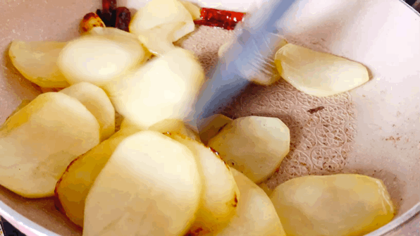 4、接着把土豆片倒入锅中,翻炒至土豆片边缘微微焦黄。