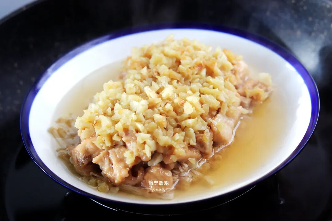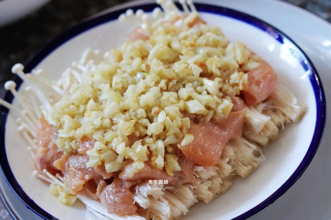 3、接下来我们把洗好的金针菇铺入盘中。再铺上我们已经腌制好了的鸡胸肉,均匀地淋上蒜蓉。