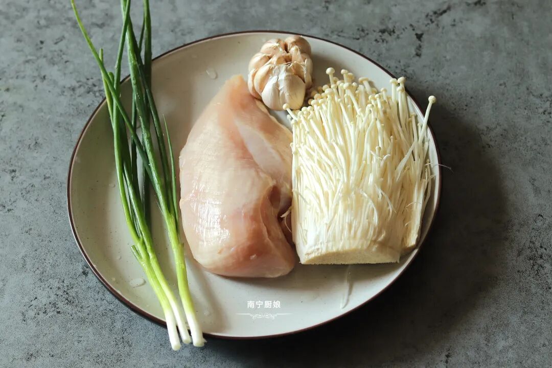 准备食材:鸡胸肉200g、大蒜1头、生抽10ml、玉米淀粉10g、糖5g、金针菇80g、食用油20g、盐(根据自己喜好酌情定量)。
