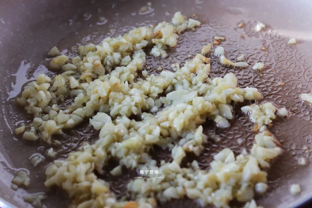 2、然后我们把切好的蒜末下油锅将其炒香,而后再加入少许的盐和糖进行调味。