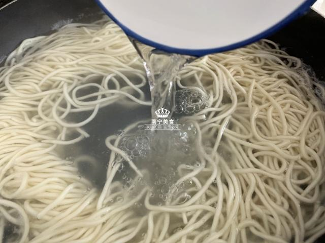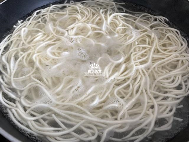 5、要开始煮面条了!再开一口锅,倒入半锅的水并烧热后下面条,调至大火将汤水煮沸,再倒入一碗凉水,几秒钟以后就可以关火啦,然后我们把面条捞出来脱脱水。(凉水可不是白加的,吃起来特别筋道!)