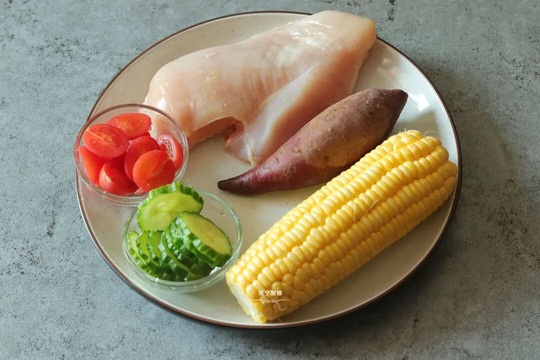 5、最后我们将蒸好的玉米和紫薯以及切好的黄瓜和小番茄,还有酱料包、鸡胸依次放入便当盒就可以啦!