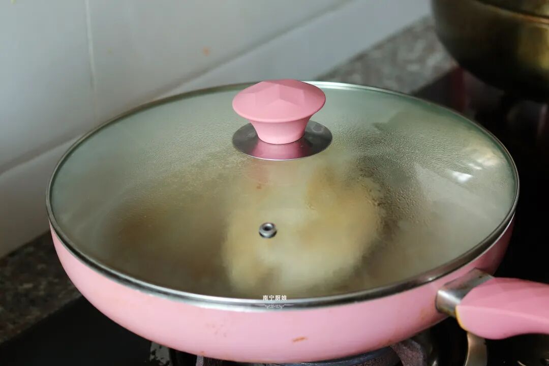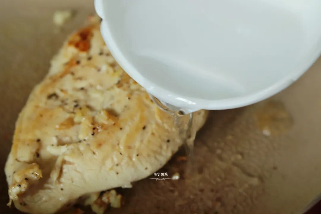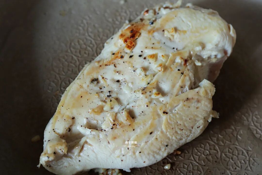 4、调至小火,倒入适量清水后盖上盖子,继续煎3分钟,等待冷却一些后,取出鸡胸肉将其切成片状即可;这时候我们的主食也已经蒸好了,可以先进行冷却,备用。