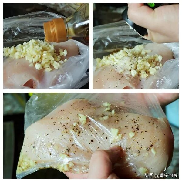 1、首先我们准备一个保鲜袋,把洗净的鸡胸肉装入保鲜袋中,然后依次倒入蒜末、生抽、料酒、黑胡椒和盐先腌制10分钟左右。
