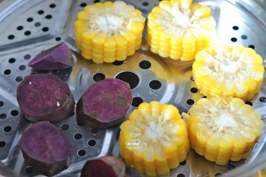 2、我们要将玉米和紫薯切成小段或小块放入锅中,开大火蒸10-15分钟。