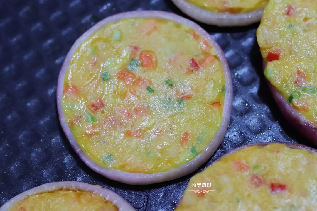 4、接下来要正式开始煎蛋饼咯!在锅中刷一层油,开小火就可以,先放入切好的洋葱圈。