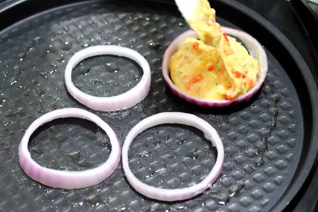首先将洋葱、胡萝卜洗净,将洋葱横向切成片状,不可太薄哦!因为稍后我们会利用洋葱圈去固定蛋液,所以可以稍微切得厚一点!将胡萝卜和火腿肠切成小丁,备用。