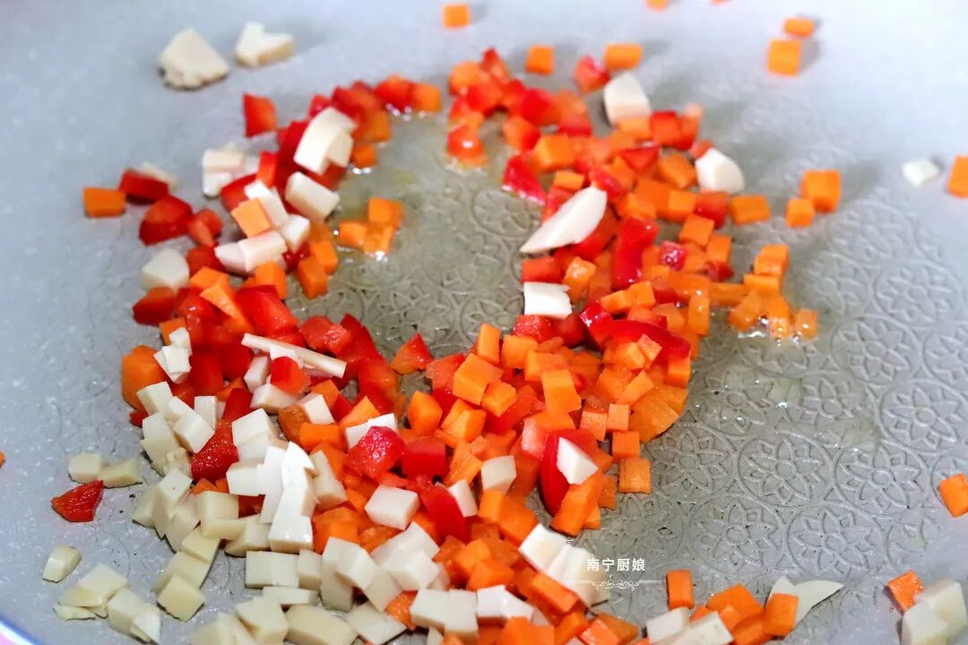 1、首先起锅烧油,油不用太多哦!烧热后将准备好的胡萝卜丁和火腿肠丁以及香葱沫倒进锅中,翻炒爆香即可出锅!
