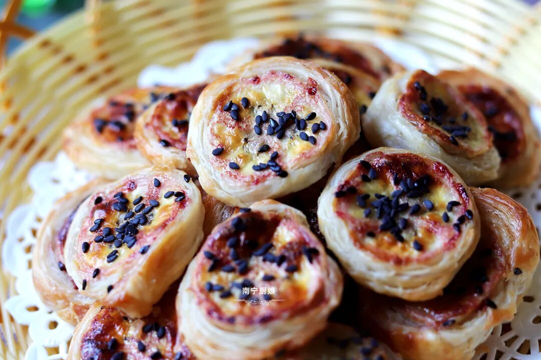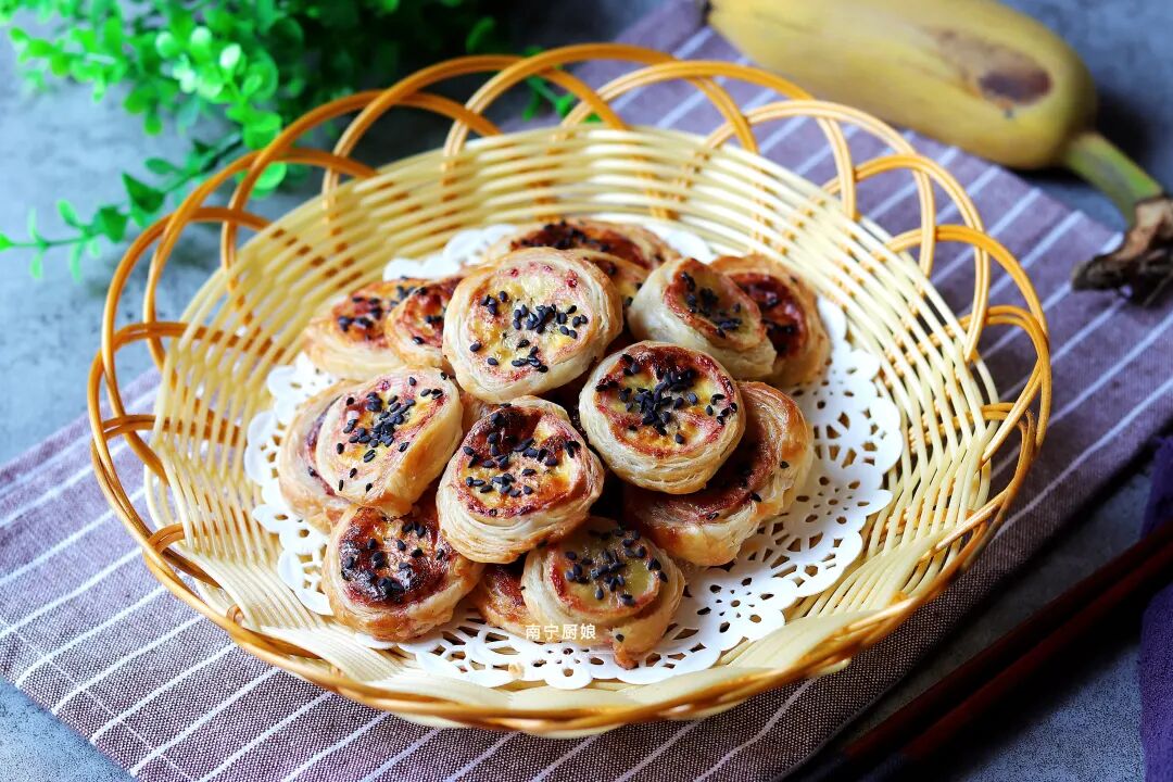 烤好后,从烤箱中拿出来,装入好看的饼篮里,一道外酥内软,吃起来甜甜的香蕉卷卷酥就做好啦!