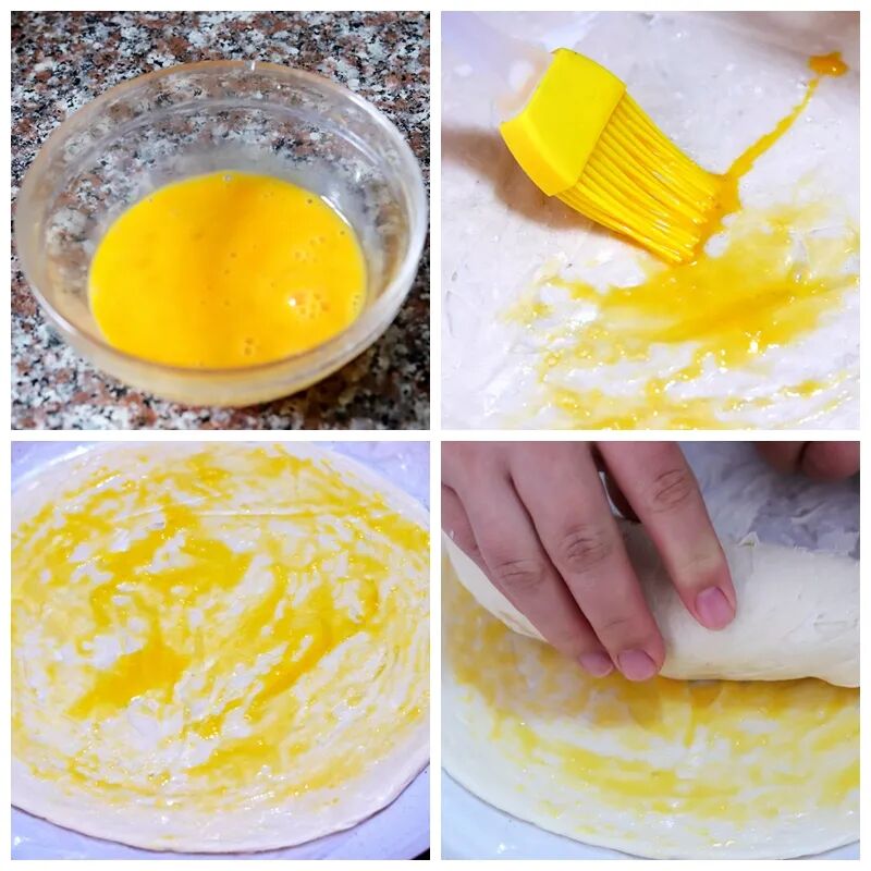 1、把鸡蛋打入碗里,放入白砂糖搅拌均匀,然后用一个刷子沾上蛋液后把整张手抓饼表面刷满蛋液,然后再把一根香蕉放到手抓饼上,把手抓饼压紧后卷实,把收口处压紧,再放入冰箱里冷冻1小时,把手抓饼冻硬来。