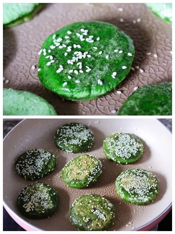 5、在平底不粘锅内刷上一层薄油,缓缓放入我们压出来的小饼,开小火适时翻面煎制,等到两面都变成金黄色时,撒上一层白芝麻,就可以出锅咯!