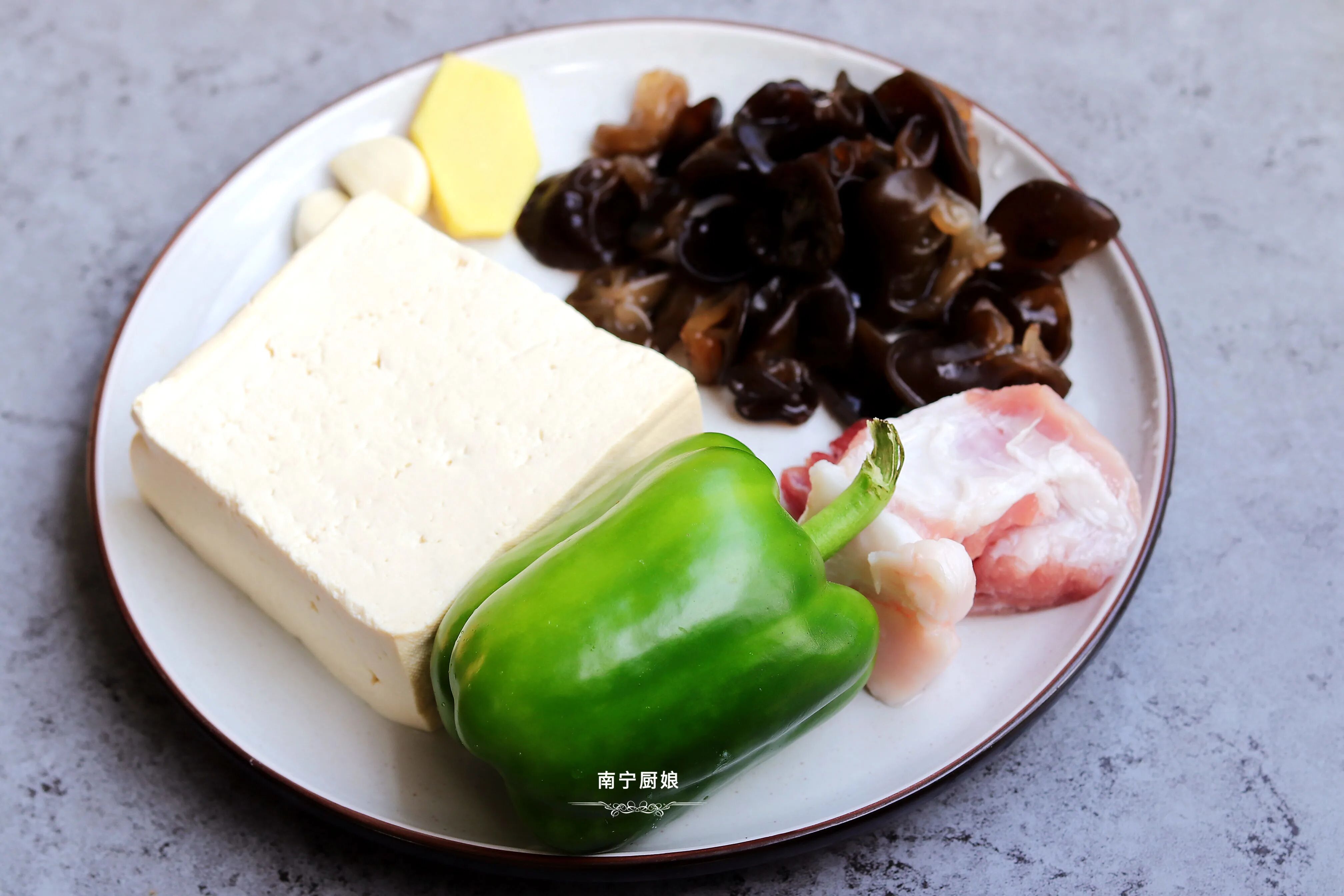 豆腐(一整块),猪肉(一块要去皮),木耳,青椒(一根),料酒,辣酱,葱姜,酱油,盐,鸡精,糖,蚝油,香油,淀粉(适量)。